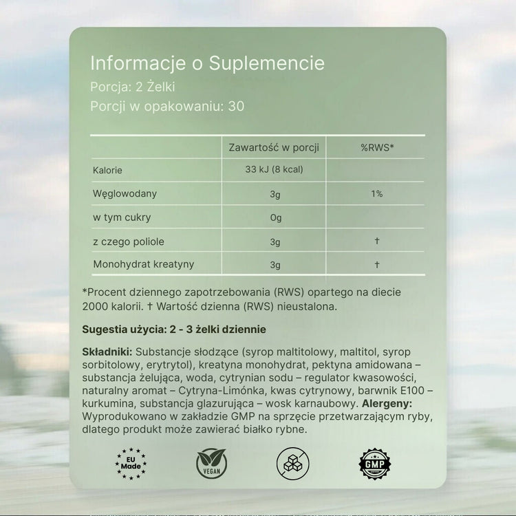 Sweeteners (maltitol syrup, maltitol, sorbitol syrup, erythritol), creatine monohydrate, pectin amidated - gelling agent, water, sodium citrate acidity regulator, natural flavouring Lemon Lime, citric acid, colorant E100 curcumin, glazing agent carnauba wax.